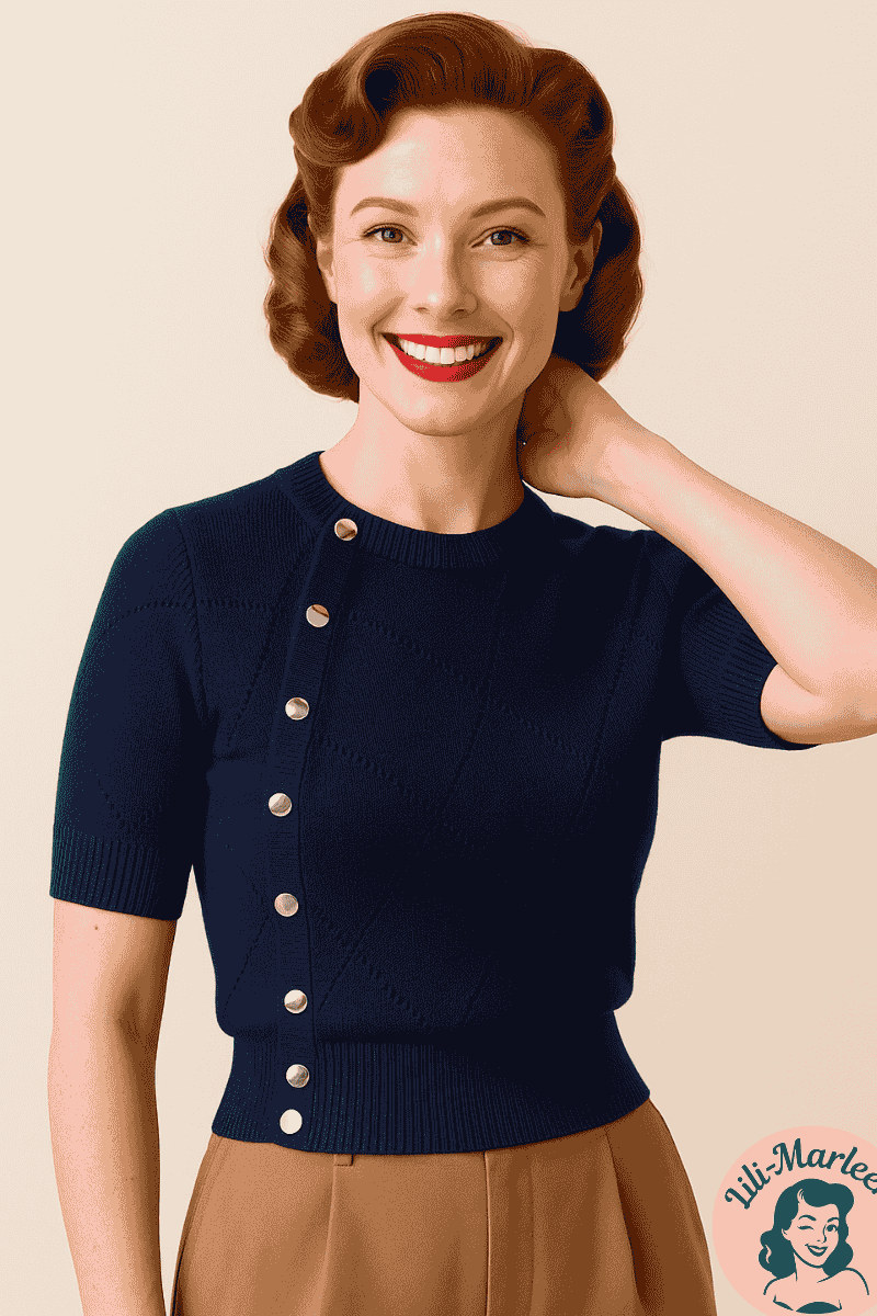 Elegant, tidløs og uimodståelig – Navy Grace er den perfekte vintage sweater til dig, der elsker 50’er-stilens rene linjer, feminine snit og klassiske detaljer.