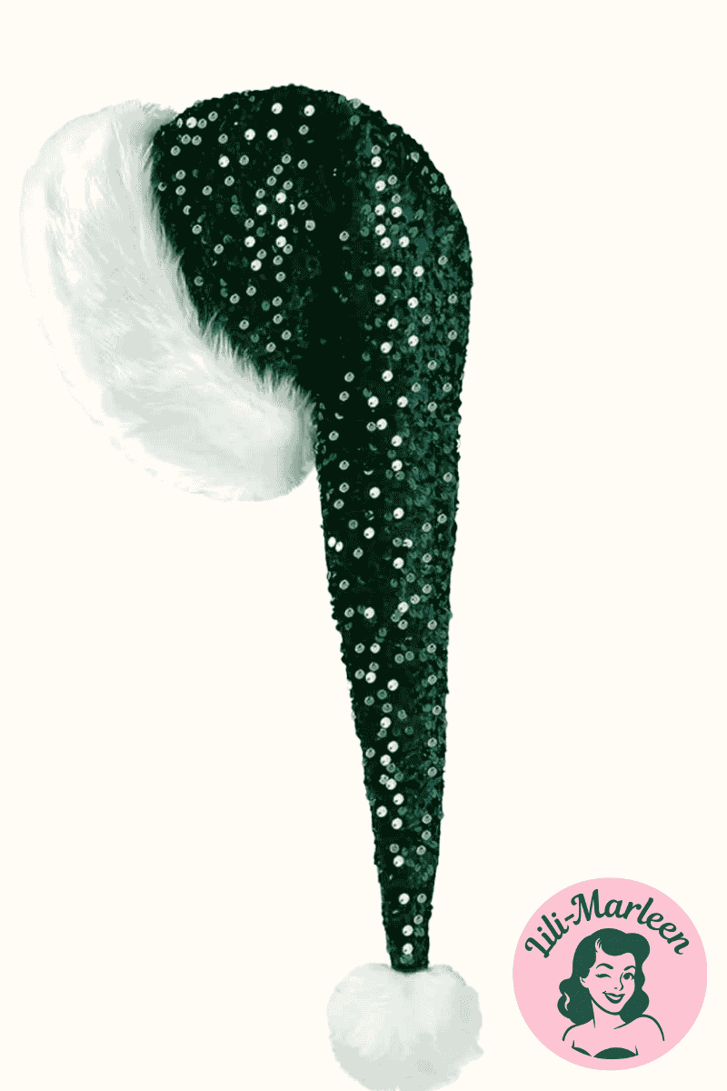 Skab ægte juleglamour med Emerald Glam – en lang, elegant nissehue dækket af funklende mørkegrønne pailletter. Den bløde hvide pelskant og den fluffy kvast giver et luksuriøst, vintage-inspireret udtryk, der oser af julefest og charme. Perfekt til både julefrokoster, fotoshoots eller når du vil være den mest stilfulde nisse i rummet.