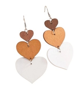 Disse charmerende øreringe med tre sammensatte hjerter i træ forener naturlig varme og legende romantik. Med farvegraduering fra mørkebrun til hvid og let, bevægelig konstruktion giver de både liv og personlighed til dit look. Et skønt valg til dig, der elsker boheme, naturmaterialer og accessories med hjerte.