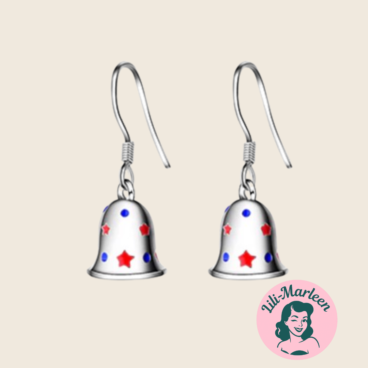 Øreringene er udformet som små klokker i blank sølvlook, dekoreret med røde stjerner og blå prikker. De måler ca. 2,5 cm i længden og har klassisk krog-lukning, der gør dem behagelige og nemme at bære hele dagen.