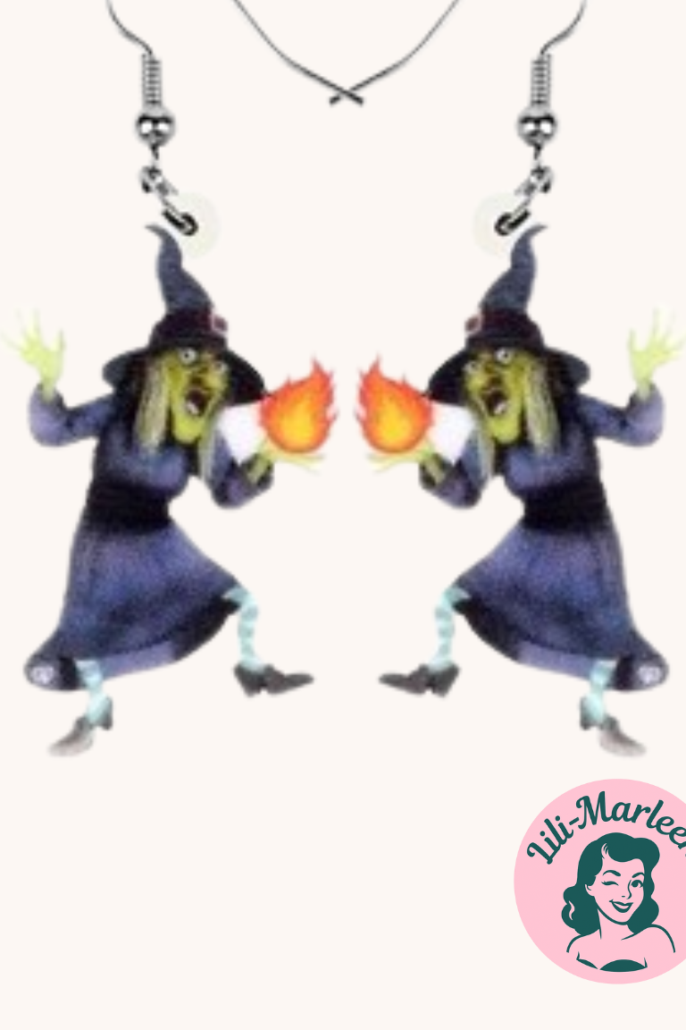 Detaljer og design Materiale: Acryl Længde: ca. 3 cm (uden krog) Farver: Mørkelilla, sort, grøn og orange Motiv: Klassisk Halloween-heks med ildkugler Krog: Sølvfarvet metal (nikkelfri) Letvægt og behagelige at bære