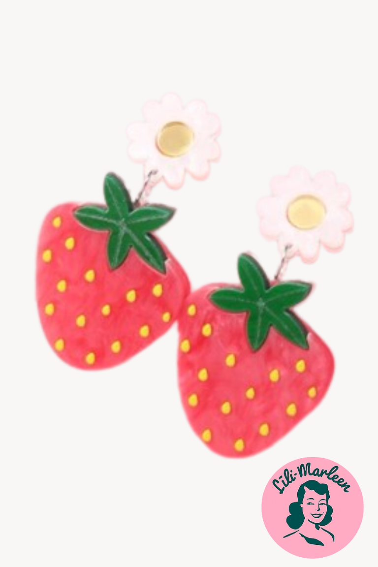 Kan man andet end at smile, når man ser disse øreringe? Store, festlige og fulde af charme – med søde jordbær hængende fra en lille marguerit. Perfekte til både havefest og hverdagsglæde.