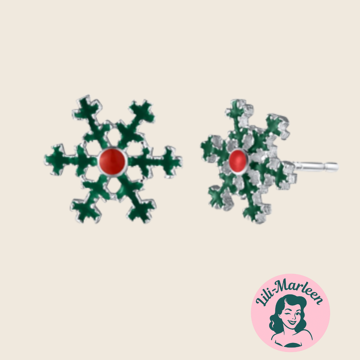 Ørestikkerne har form som snefnug med grøn emalje og en rød midte, der minder om julens bær. De måler ca. 1,1 cm og er fremstillet i ægte 925 sterling sølv med klassisk ørestik-lukning – lette og behagelige at bære hele dagen.