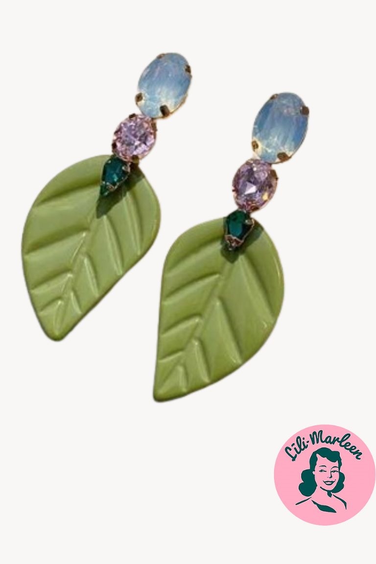 Disse charmerende øreringe i olivengrøn bladform er det perfekte miks af naturinspiration og retro glamour. Med tre iøjnefaldende sten i blå, lavendel og smaragdgrøn får du et par øreringe, der både emmer af 50'er-stil og moderne farveleg.