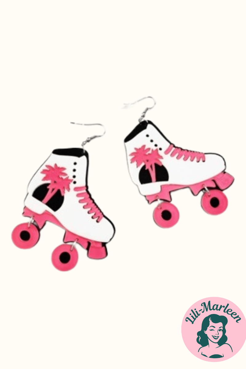 Øreringe – Rulleskøjter – store, pink/hvide hængeøreringe med retro-attitude: De her øreringe larmer på den gode måde. Et par rulleskøjter, der hænger og gynger som en flirt med 80’erne – pink hjul, palmestemning og en energi, der siger: “Jeg kommer ikke for at være diskret”. De er store, fede og lige så unapologetic som en tur på dansegulvet i neonlys.