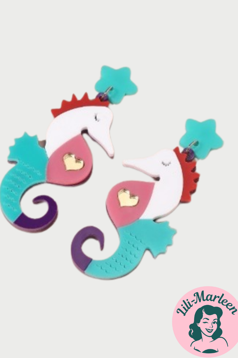 Et par sjove og farverige øreringe formet som søheste – perfekte til dig, der elsker at skille dig ud og lege med dit look. Øreringene er lavet i let plastik, så de trods deres størrelse er behagelige at have på. De flotte farver kombinerer turkis, rød, pink, lilla og hvid med små gulddetaljer, hvilket giver et legende og unikt udtryk.