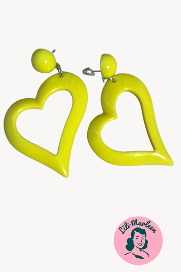 Fald pladask for Vilde Hjerter – et par store, frække hjerteøreringe i klar neongul plastik, der råber kærlighed, flirt og vintage attitude. Perfekte til dig, der tør vise dine vilde sider og give hverdagen et lille girl power-løft.