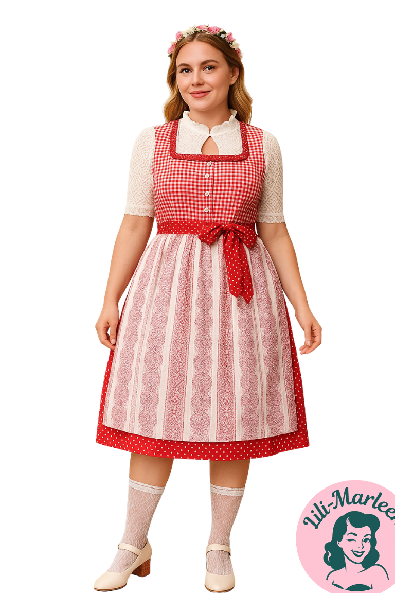 Gør dig klar til efterårets fester med den sødeste oktoberkjole i røde og hvide farver! Denne skønne kjole kombinerer romantiske tern og blomsterprint med et smukt corsagedesign og et elegant blonde-forstykke, der sidder perfekt. Perfekt til enhver efterårsfest!