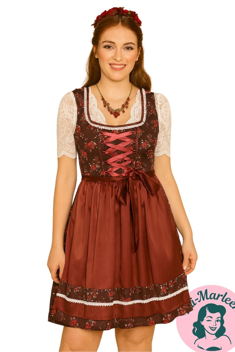 Den sødeste oktoberkjole i vinrød/chokolade med blomster print, smukt corsagedesign og et elegant satin forklæde. Perfekt til efterårets fester!