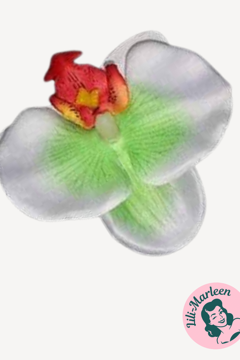 Udover feminint tøj elsker vi alle at pynte os – og denne orkidé hårclips i hvid/grøn er det perfekte tilbehør til at fuldende dit look med lethed og elegance. Den friske farvekombination giver et naturligt og stilfuldt udtryk, der passer perfekt til både fest, dans, bryllup og hverdagsbrug.