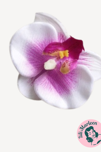 Udover feminint tøj elsker vi alle at pynte os – og denne orkidé hårclips i hvid/lilla er det perfekte tilbehør til at fuldende dit look med lethed og elegance. Den smukke farvekombination giver et feminint og legende udtryk, der passer perfekt til både fest, dans, bryllup og hverdagsbrug.