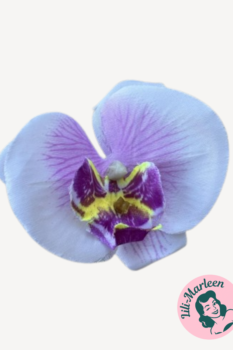Udover feminint tøj elsker vi alle at pynte os – og denne orkidé hårclips i hvid/lys lilla med et diskret gult strejf er det perfekte tilbehør til at fuldende dit look med lethed og elegance. Den delikate farvekombination giver et friskt, romantisk og feminint udtryk, der passer perfekt til både fest, bryllup, dans og hverdagsbrug.