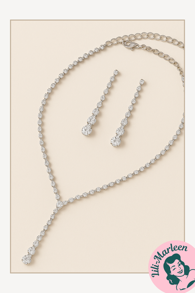 Den fine halskæde med Y-facon og matchende, lange øreringe er prydet med funklende klare sten, der fanger lyset ved hvert eneste skridt. Perfekt til at matche både en enkel kjole og et mere glamourøst look.