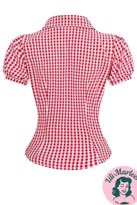 Denne feminine skjorte i klassisk rød- og hvidternet mønster er et must-have til vintageelskeren. Skjorten fremhæver taljen med sin figursyede pasform, mens de korte pufærmer og den lille krave giver et charmerende retro-look. Perfekt til både jeans, nederdele og højtaljede bukser.