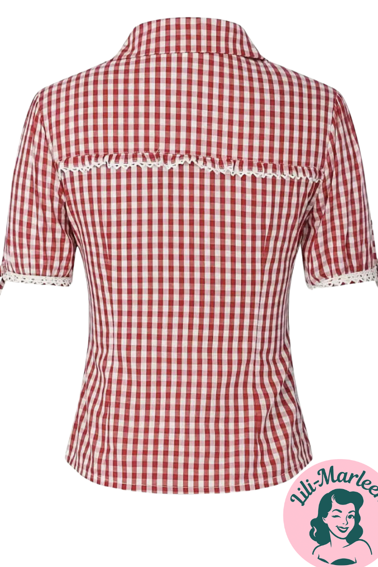 Retro Gingham, plus – Rød Ternet Skjorte med Blondekant