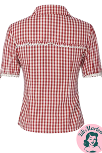 Denne røde og hvidternede skjorte kombinerer vintage-charme med feminine detaljer. De korte ærmer med bindebånd og den fine blondekant giver et romantisk og retroinspireret udtryk, mens pasformen gør skjorten behagelig og stilfuld på samme tid.