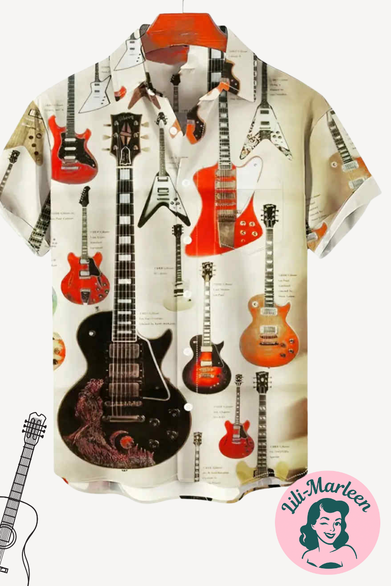 Skru op for stilen og sæt strøm til garderoben med denne ikoniske guitarskjorte! Perfekt til dig, der elsker musik, attitude og en skjorte, der spiller med på festen. Med klassiske guitarillustrationer i varme farver og vintage-look, er den en sikker vinder til både sommerfester, musikdage og til hverdagens stilfulde statement.