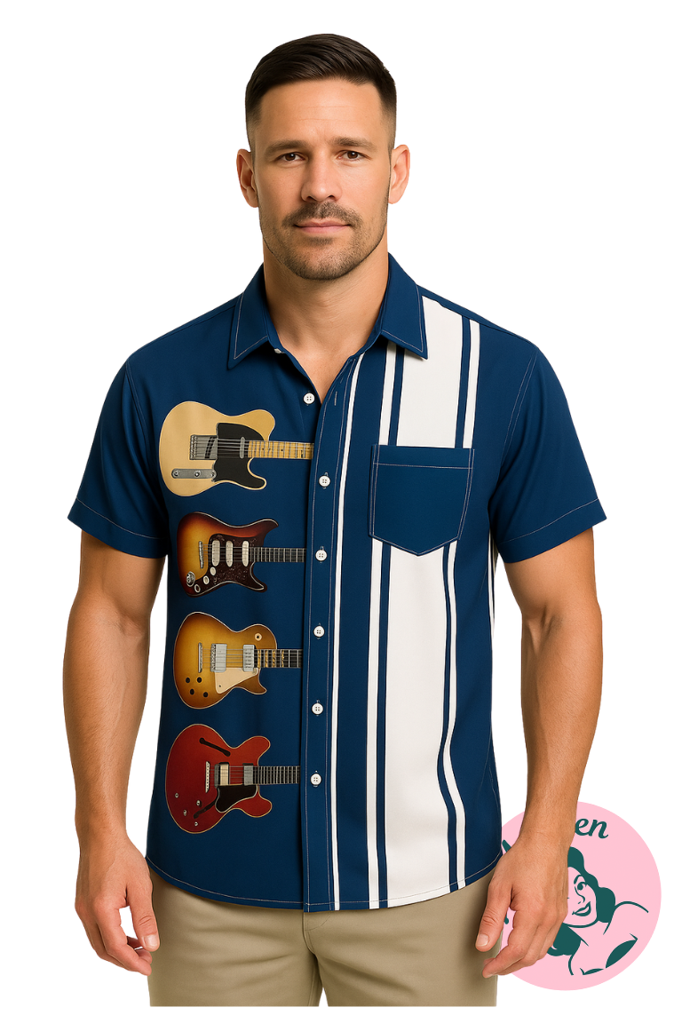 Rock’n’Roll Style – Blå Skjorte med Guitarprint