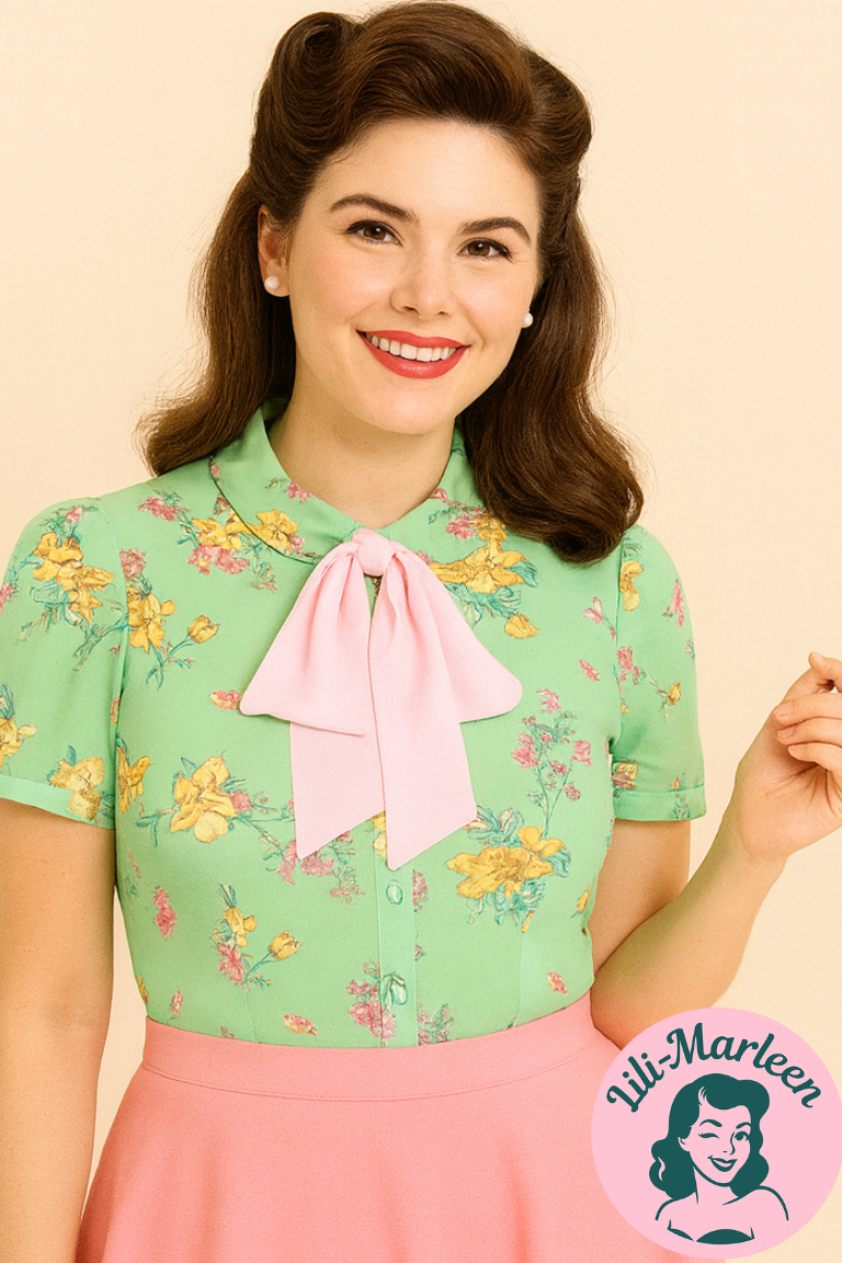 #RomantiskStil #HellBunny #LysgrønSkjorte #FloraFashion #LyserødSløjfe #ModeMedStil #LiliMarleenFashion #FriFragt #HurtigLevering #IngenGebyrer