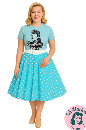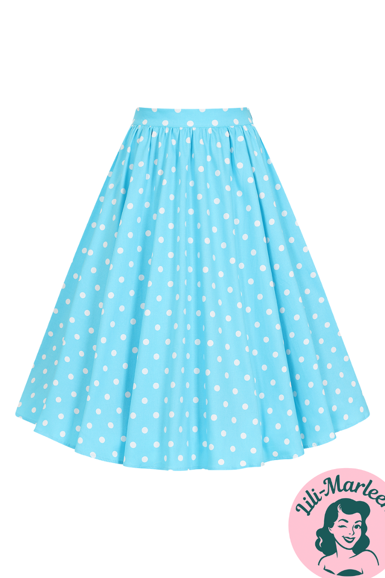 Vores kærlighed til 50’erne lever videre med Ruth Polka Dot Swing Skirt fra Heart & Roses London Denne skønhed kombinerer klassisk vintagecharme med moderne komfort. Den dybe blå farve med hvide polkaprikker giver et legende og iøjnefaldende retro-look, mens det højtaljede snit og det fulde, rynkede swingskørt fremhæver figuren på smukkeste vis.