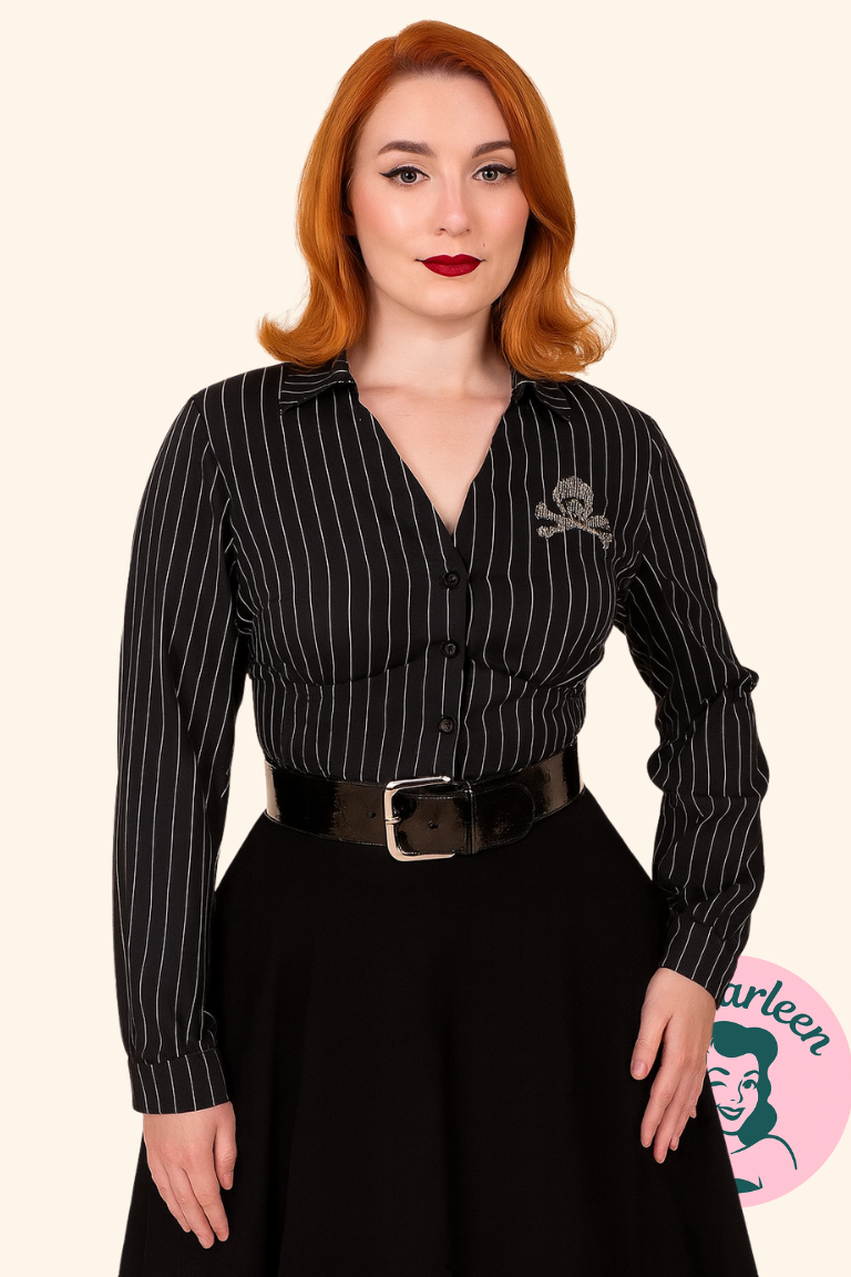 Sally Skjorte – Sort med Hvide Striber og Skull Print