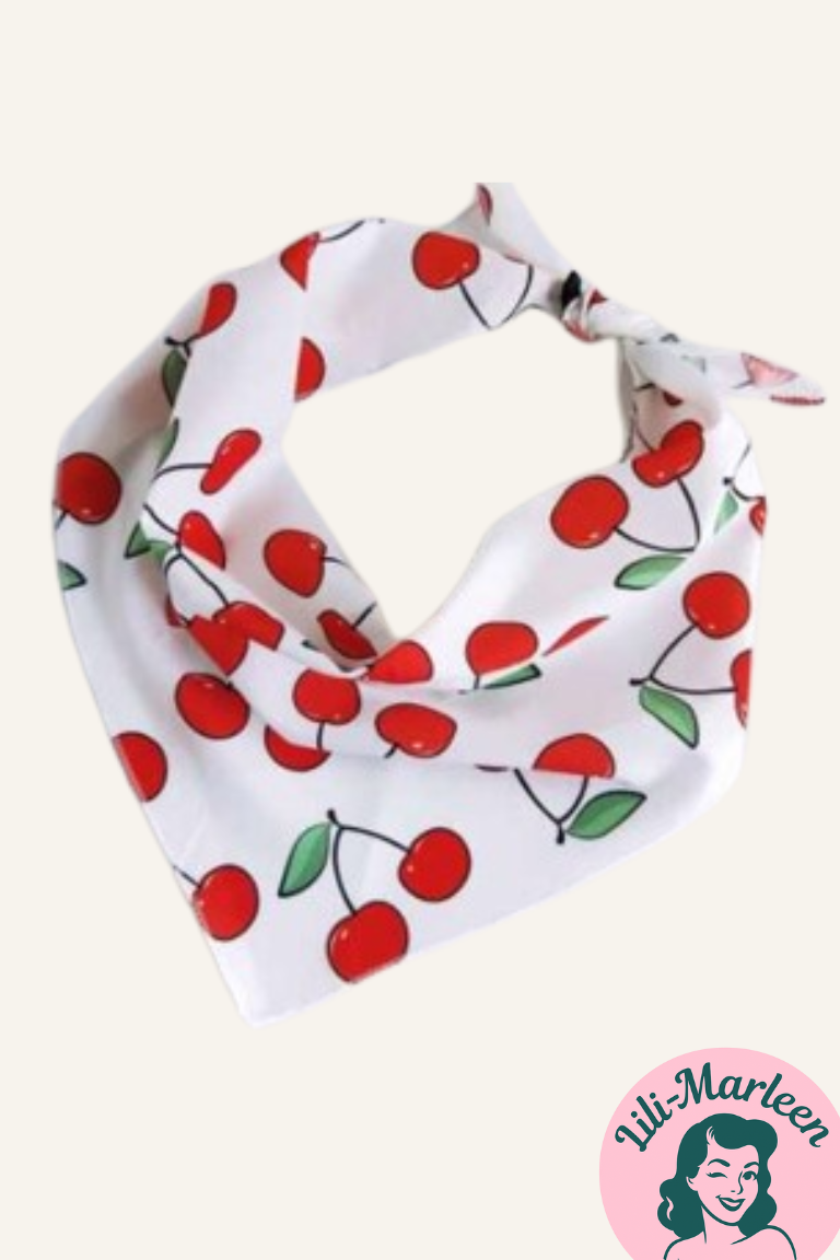 Et let og legende tørklæde med friske røde kirsebær og grønne stilke på hvid baggrund. Et design, der emmer af sommer, picnics og pinup-vibes – perfekt til dig, der elsker at tilføje et strejf af glæde og nostalgi til dit outfit.