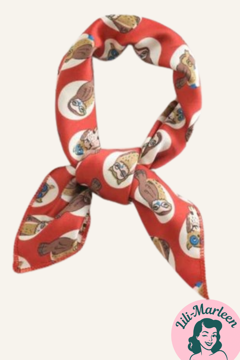 Et skønt og legende tørklæde i glansfuld satin med et humoristisk og charmerende ugleprint på rød baggrund. Det kvadratiske format og den bløde overflade gør det perfekt til både afslappede og kreative looks.