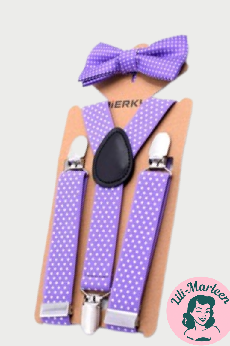 Et festligt og farverigt sæt til børn bestående af en lilla butterfly og matchende seler med hvide prikker. Det klassiske polkaprint giver et retro og legende udtryk, mens den lilla farve tilfører et unikt og charmerende touch. Selerne er justerbare med stærke clips, og butterflyen har en fleksibel rem, hvilket gør sættet både behageligt og praktisk. Perfekt til festlige lejligheder, hvor outfittet skal have lidt ekstra personlighed.