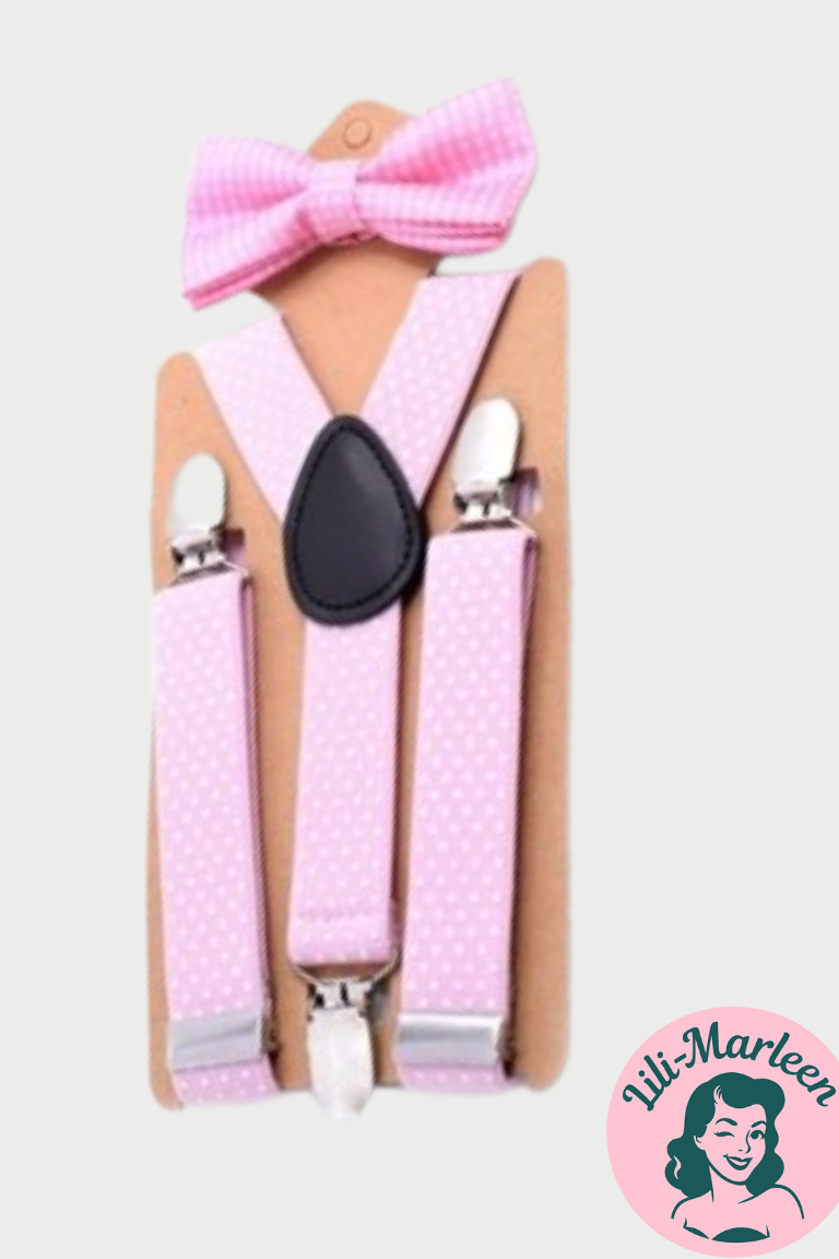 Dette lyserøde børnesæt med butterfly og seler i hvide prikker er en charmerende accessory-pakke, der fuldender ethvert festlook med retro charme.