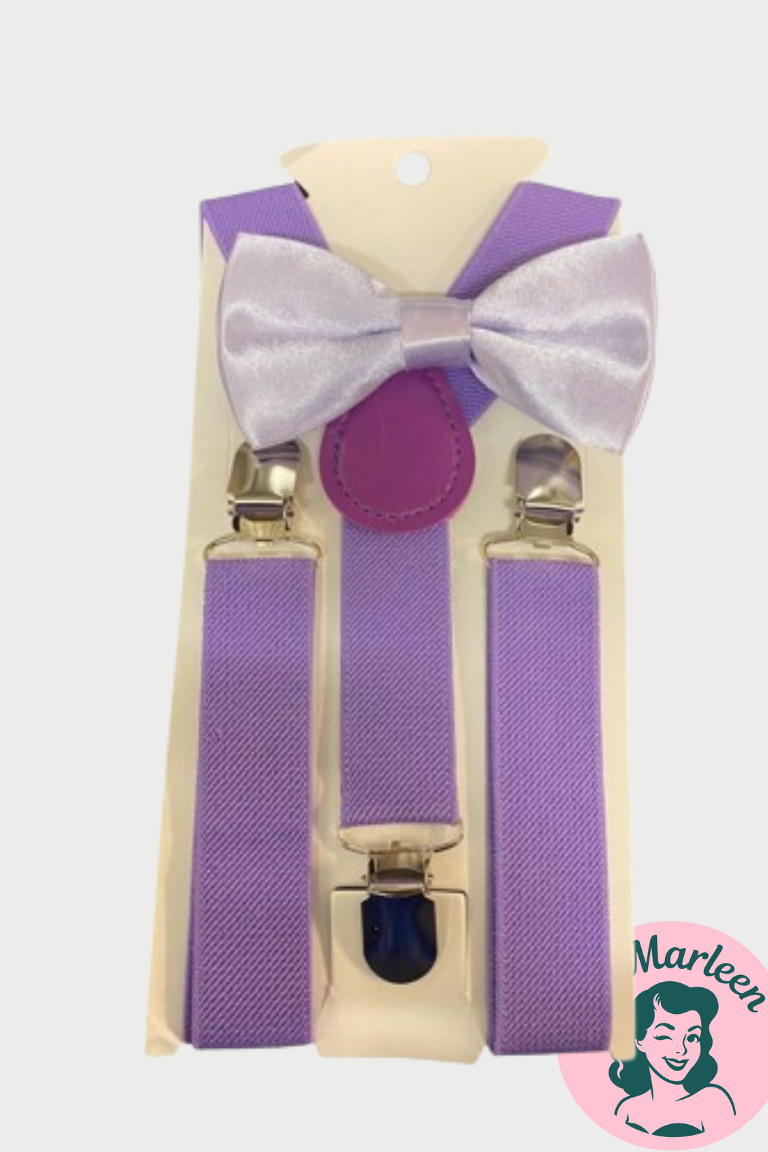 Et elegant og farverigt sæt til børn bestående af en sølvfarvet satinbutterfly og matchende lilla seler. Kombinationen af det blanke sølv og den klare lilla giver et unikt og festligt udtryk, perfekt til at skille sig ud på den stilfulde måde. Butterflyen har en satinfinish for et eksklusivt look, og selerne er justerbare med stærke clips, så de passer til forskellige størrelser.