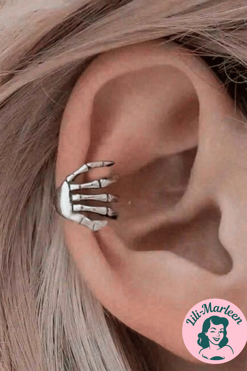 Et modigt lille mesterværk til øret. “silver Grip” er en detaljeret øreklemme i guldlook, formet som en elegant skelet-hånd, der griber let om dit øre og giver dig et udtryk med både kant og karakter. Perfekt til dig, der elsker accessories med attitude, humor og et strejf af vintage rock’n’roll.