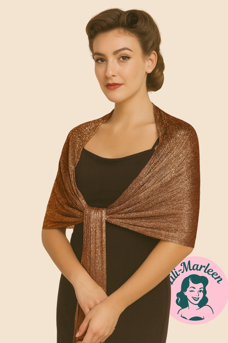 Detaljer og design: Størrelse: 170 x 60 cm – langt nok til at dække skuldre eller bindes foran Materiale: 100% chiffon med let glittereffekt Farve: Chokolade-brun med metallisk glans Frynser i enderne og dekorativ ringlukning Vask: Skånevask – undgå tørretumbler