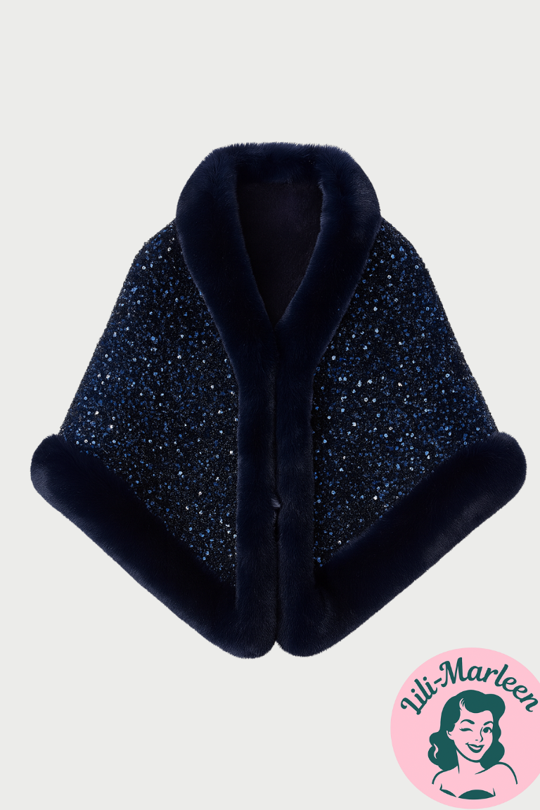 Et elegant slag i klassisk navyblå med glitrende pailletter og blød pelskant. Perfekt til vinterbryllupper, gallafester og særlige lejligheder, hvor du ønsker et luksuriøst og festligt udtryk. Slaget giver både varme og glamour, så du kan føle dig smuk og komfortabel hele aftenen.