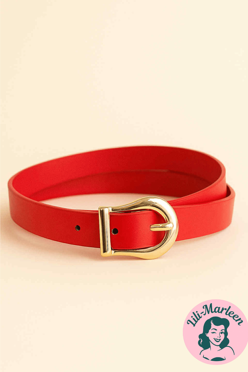Et guldfarvet bælte er prikken over i’et, når du vil tilføre din garderobe et strejf af vintage glamour. Dette smalle bælte i rød PU-læder er både funktionelt og stilfuldt – og et perfekt valg, når du vil markere taljen og skabe blikfang. Brug det til både hverdag og fest for et raffineret og retroinspireret udtryk.