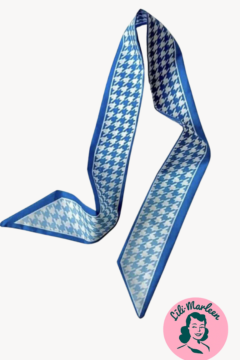 Dette fine pyntetørklæde er som skabt til at give dit outfit et diskret men stilfuldt pift. De blå nuancer med det klassiske hundetandsmønster giver et elegant og tidløst look, mens størrelsen gør det oplagt som både lille hårbånd, mini-slips eller charmerende detalje på tasken.