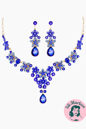 Lydia, blå er som en nattehimmel over Rivieraen – dyb, dragende og med et spil af lys, der får hjertet til at slå lidt hurtigere. Smykkesættet består af en overdådig halskæde og matchende øreringe, sat med funklende blå sten i flere nuancer og smukke blomster- og stjernemotiver, som giver et fortryllende og feminint udtryk. Den store blå dråbe understreger hele looket med et strejf af drama og elegance.