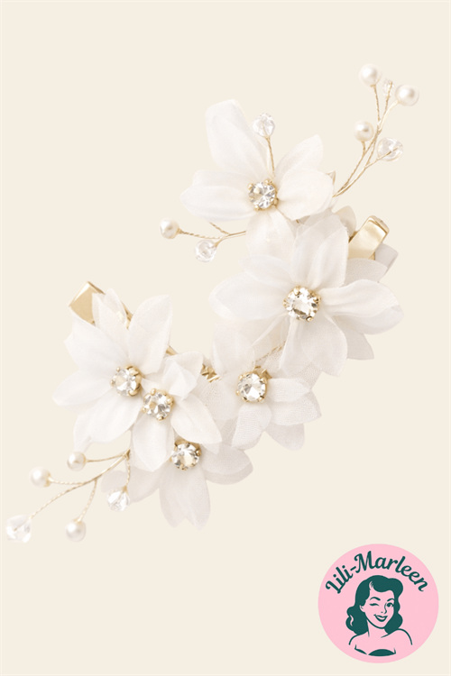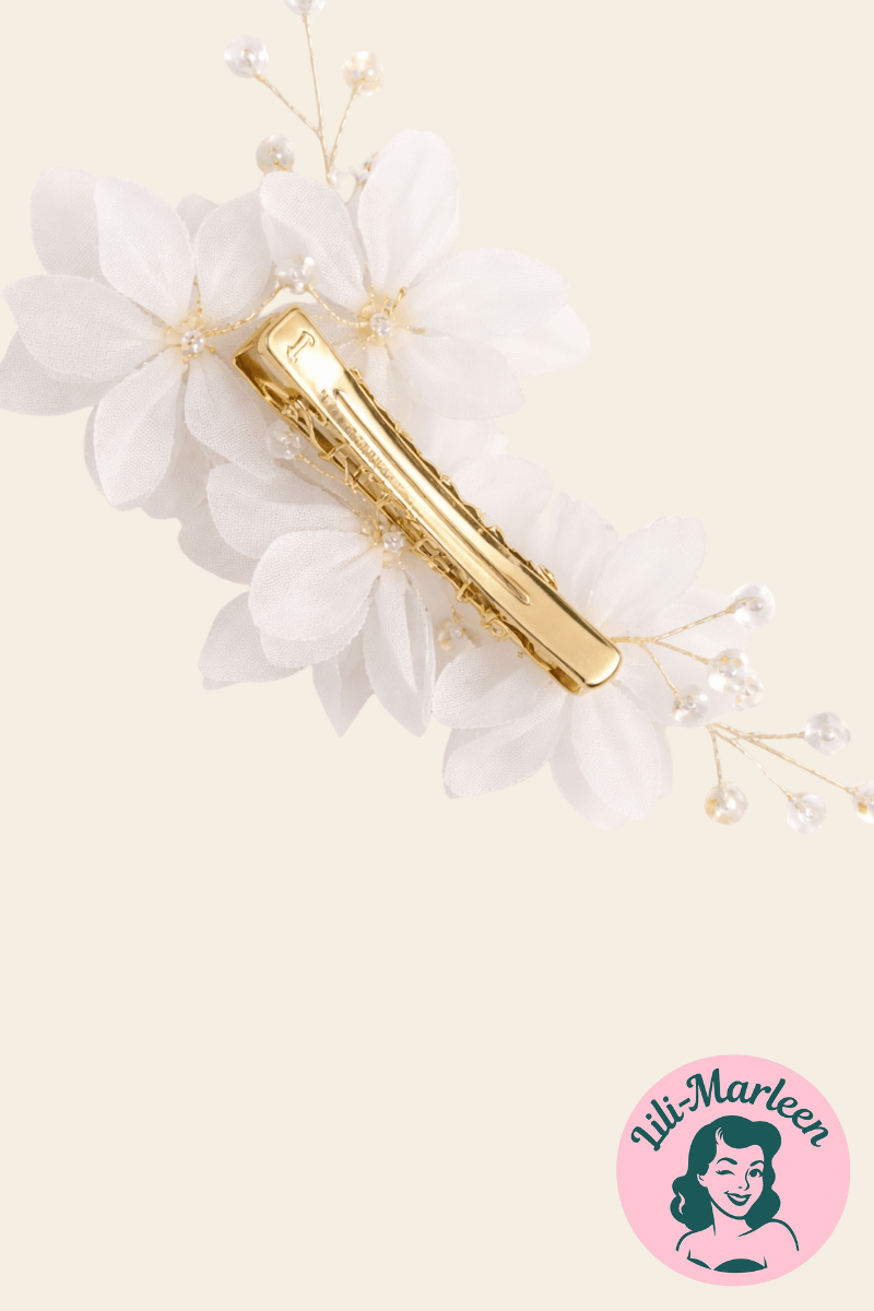 Stor Hårklips i Hvid med Blomster, Perler og Gulddetaljer – Romantisk Statement: Denne store hårklips er skabt til dig, der vil have maksimal effekt med et let og elegant udtryk. De hvide, transparente blomster kombineres med fine perler, funklende rhinsten og gyldne detaljer, som giver et eksklusivt, brudeinspireret look uden at blive tungt. En hårklips, der både kan bære frisuren og udtrykket.