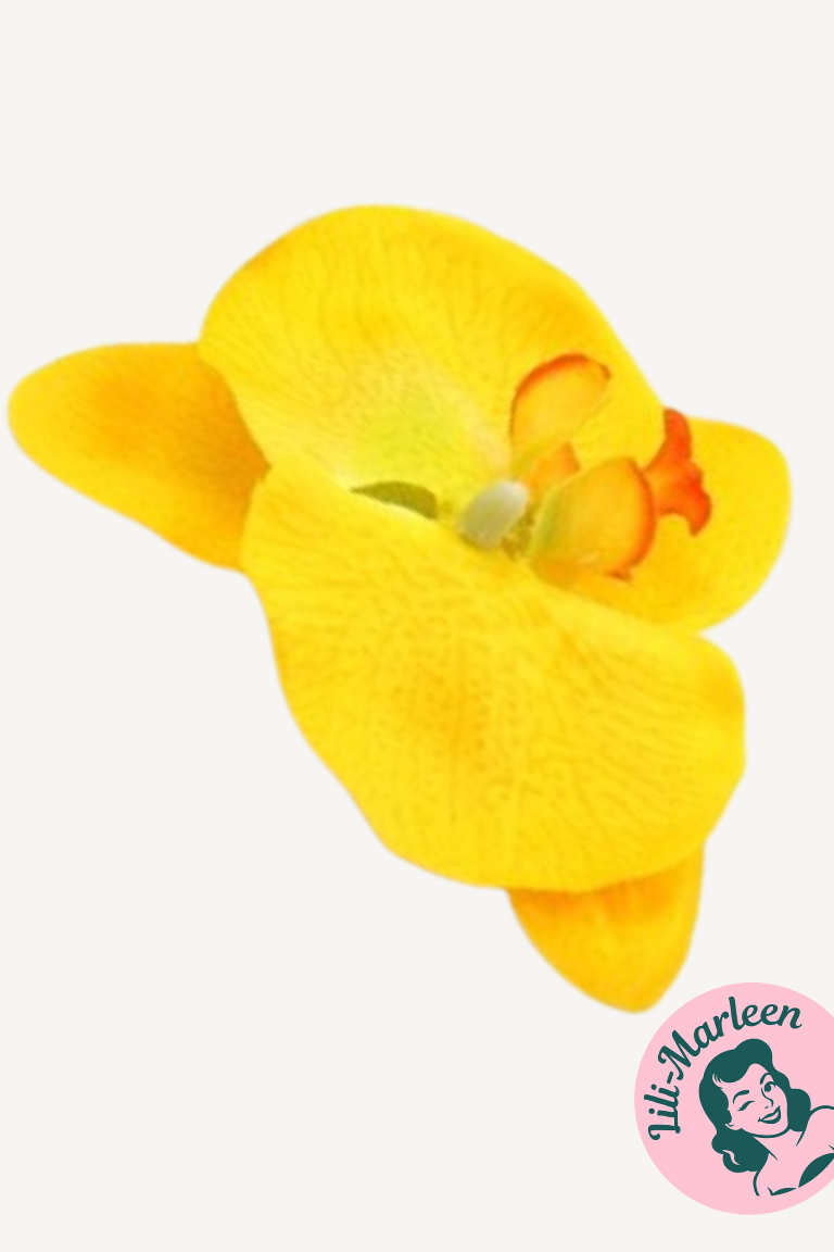 Giv dit hår et blomstrende touch med denne gule orkidé hårclips – et smukt og feminint tilbehør til enhver lejlighed.