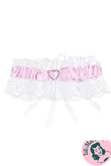 Gør din bryllupsdag endnu mere mindeværdig med vores søde strømpebånd i klassisk hvid med lyserød satingbånd. Hvert bånd er smukt designet med delikate hvide blonder og et satinbånd, prydet med en satin-sløjfe og et charmerende hjerte med glitrende sten i midten.