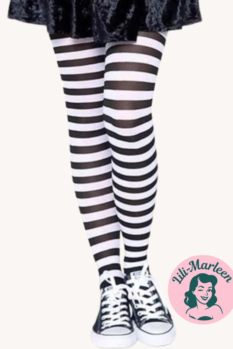 Hos Lili-Marleen elsker vi at gå all in på sjovt og farverigt tilbehør, og disse funky strømpebukser i sort/hvid striber er perfekte til at fuldende dit Halloween-look (hvis du er Beetlejuice fan er disse jo et must have) eller til at pifte et hverdagsoutfit op – bare fordi!