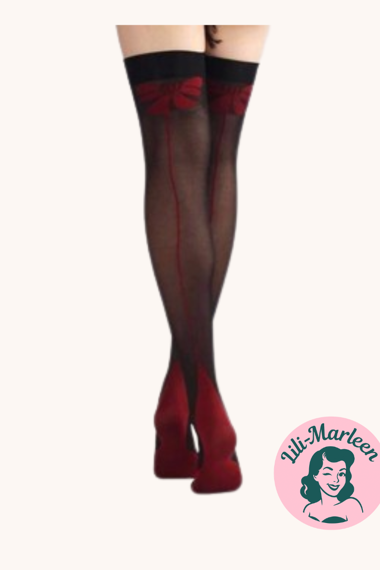 Disse forførende sorte strømper med rød søm og elegant sløjfe bagpå er designet til at fremhæve dine ben og give et feminint og selvsikkert udtryk. Perfekte til både festlige lejligheder og hverdage, hvor du vil tilføje lidt ekstra glamour.
