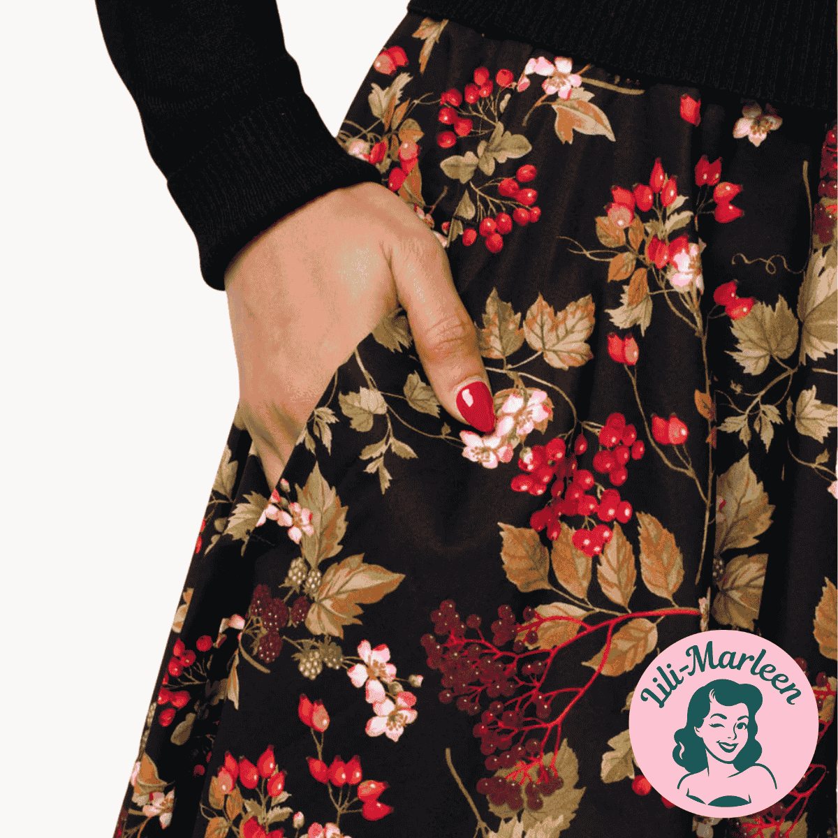 Lad efterårets farver folde sig ud med Miss Edwina – en elegant swingnederdel i klassisk 50’er-snit med et smukt print af efterårsblade og blomster på dybsort bund. Nederdelen kombinerer vintage-elegance med naturens poesi og skaber et look, der både er feminint, varmt og tidløst.
