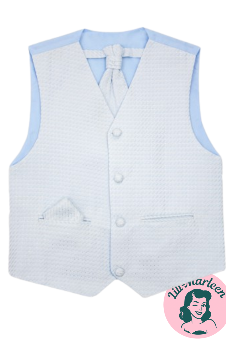 Villads-vestsættet i lyseblå er et elegant og frisk valg til drenge, der skal være festligt klædt på til store begivenheder. Den lyse nuance og det fine mønster giver et charmerende og eksklusivt look, som passer perfekt til bryllup, konfirmation, fødselsdag eller andre højtider. Med vest, slips og charmeklud får du et komplet sæt, der kan bruges alene over skjorte eller som supplement til et jakkesæt.