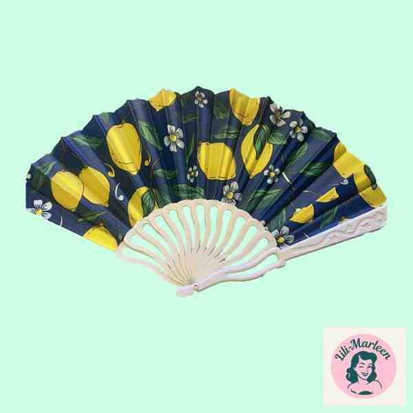 Tilføj et friskt og energisk twist til dit outfit med Miss Lemon Zest Vifte – en smuk håndvifte med et livligt citronprint på en elegant mørk baggrund.