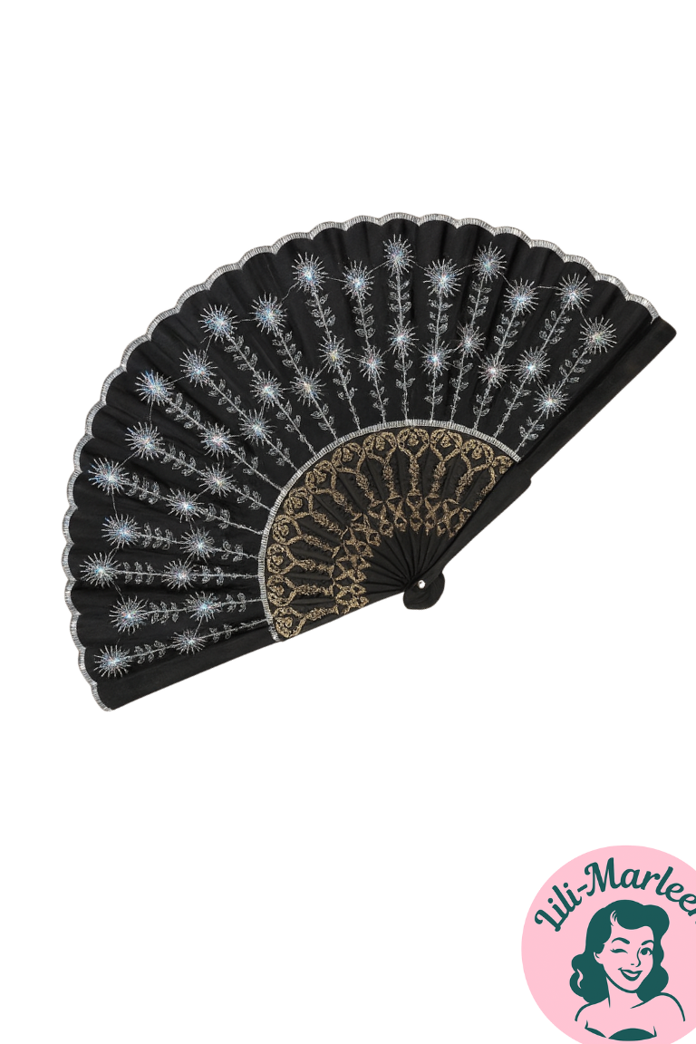 En sofistikeret sort vifte med smukke sølvornamenter, der tilfører dit look et strejf af vintage-elegance. Viften er let, praktisk og samtidig et dekorativt tilbehør, der kan bruges både til varme sommerdage og festlige lejligheder.