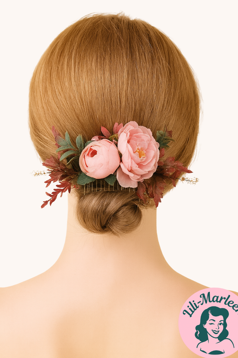 Tilføj et strejf af romantik til dit look med denne elegante hårkam, udsmykket med smukke lyserøde blomster og vinrøde blade. Et feminint og iøjnefaldende accessory, der fuldender enhver frisure – perfekt til både bruden, brudepigerne eller gæsten, der ønsker at stråle.