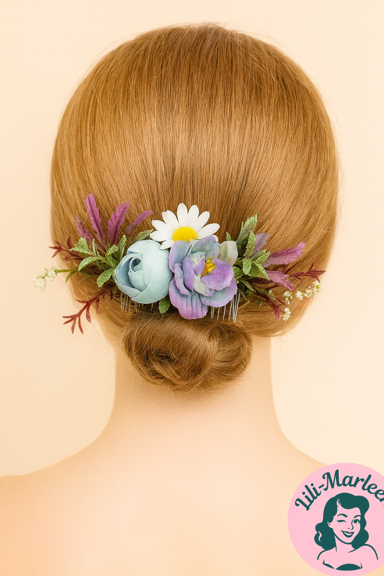 Tilfør et strejf af farverig elegance til din frisure med denne smukke hårkam. Dekoreret med blå og lilla blomster, hvide margueritter og grønne blade – en harmonisk blanding, der giver et både friskt og romantisk udtryk. Perfekt til bryllup, fest eller enhver særlig anledning, hvor du vil stråle.